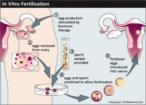 implanted in your uterus and the rest are stored. Multi step process (called a cycle) in which yours eggs are extracted and fertilized with sperm in laboratory. Once embryos develop, one or two are